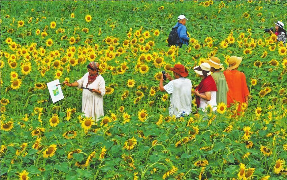 8月初,大连瓦房店市八里村大面积向日葵花开正艳,村民充分利用交通和土地优势,种植百亩向日葵,建设农家乐,以美丽花海和农家风情吸引游客,为乡村全面振兴注入新动能。图为八里村迎来大批游客观光拍照。