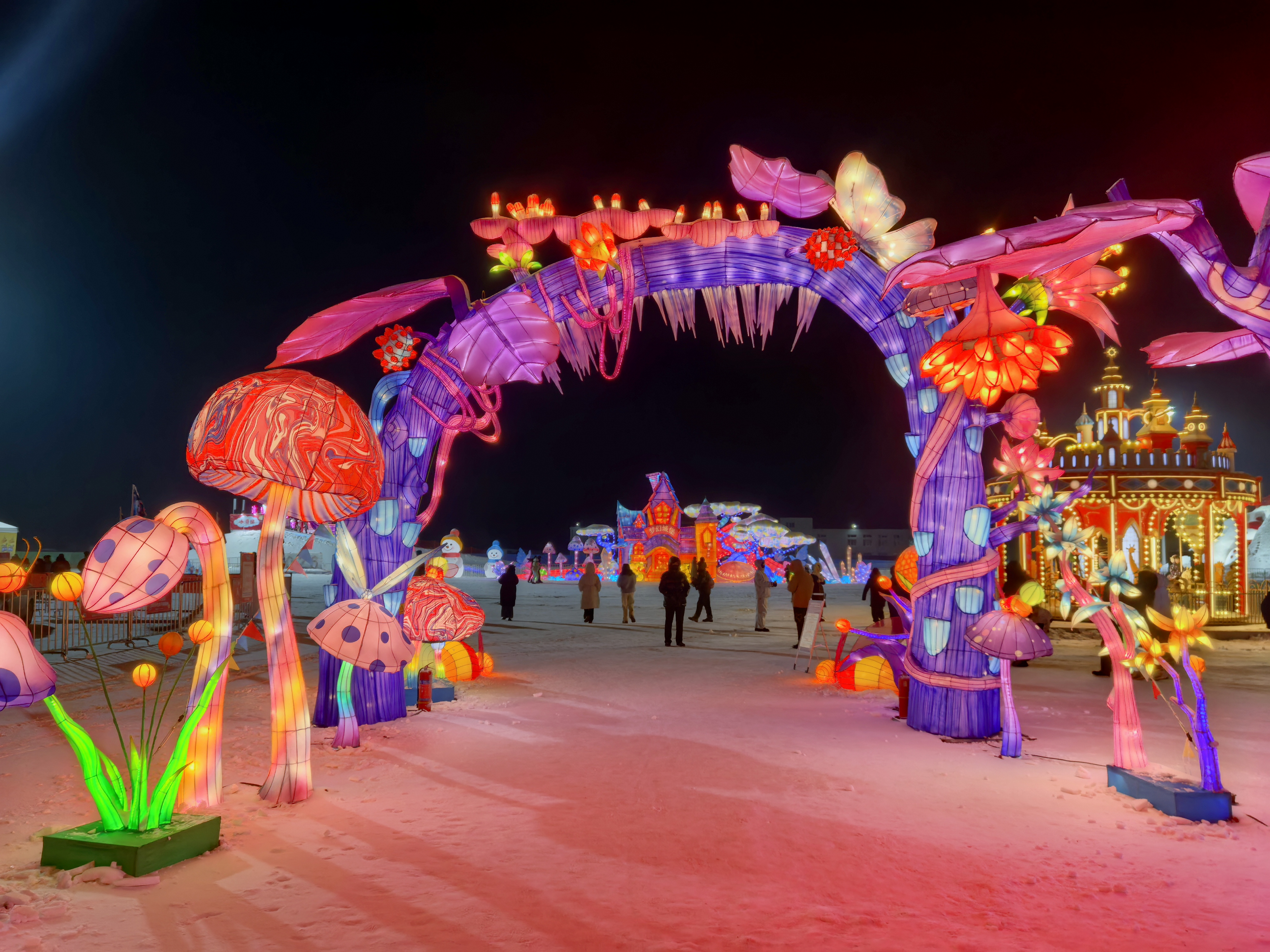 这座占地约4万平方米的“冰雪欢乐谷”,精准把握全年龄段游客的多元化需求,精心设计了20余项冰雪娱乐活动。从充满速度与激情的极速冰滑梯、雪山冲浪,到适合全家齐上阵的梦幻冰场、欢乐雪圈;从承载着70后、80后集体记忆的滑冰车、抽冰尜等传统冰嬉项目,到让孩子们尽情释放天性的雪地撒欢区,真正实现了“一站式”满足所有游客对冬日玩雪的全部想象。园区内还打造了冰雕、雪雕等多处艺术景观,“巨型雪人”憨态可掬,传统花灯技艺与现代冰雪工艺巧妙融合,古树、蝴蝶等元素构成的魔法奇幻灯组,在夜幕降临时华彩绽放,营造出“灯雪交融”的梦幻景象,成为游客争相打卡拍照的“出片”胜地。