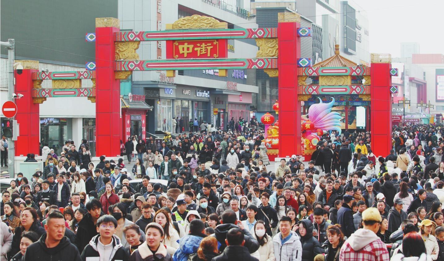 春节假期,沈阳中街年味十足,游人如织。