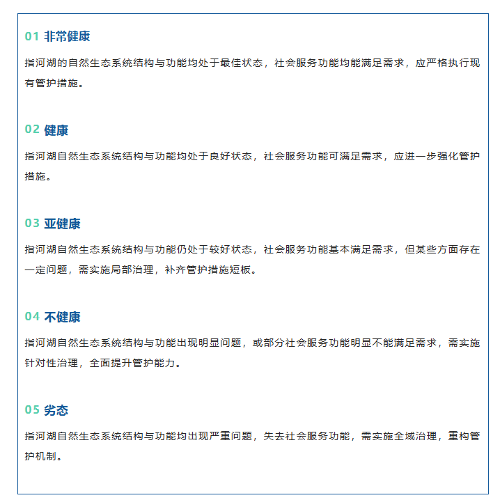 为全面了解河湖的“身体情况”,2023 年水利部全面启动河湖健康评价及河湖健康档案建立工作。并要求完成河湖健康评价后尽快整理形成健康档案,至2025年已建立2.16万条河湖健康档案。河湖健康档案的内容主要涵盖河湖的基础信息如河湖名称、最高层级河湖长、河湖代码、河流长度、河流流域面积(湖泊水面面积)、流经县级行政区域、河湖的健康信息,如健康评价依据、健康评价指标、健康评价得分、健康状态等。其中最能直接反映河湖“身体情况”的健康状态按非常健康、健康、亚健康、不健康、劣态5个等级划分。