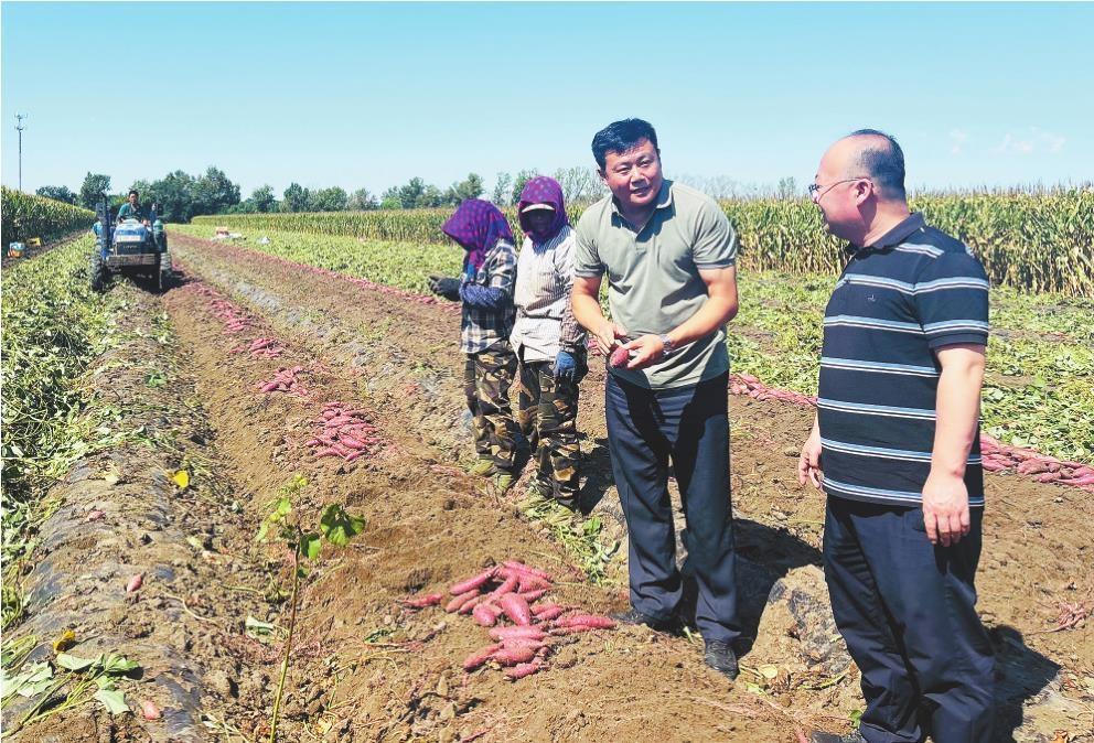 沈阳市康平县方家屯镇十家子村党总支书记孙旭新(右二)在地瓜机收现场,查看今年“红毛子”地瓜的收成情况。
