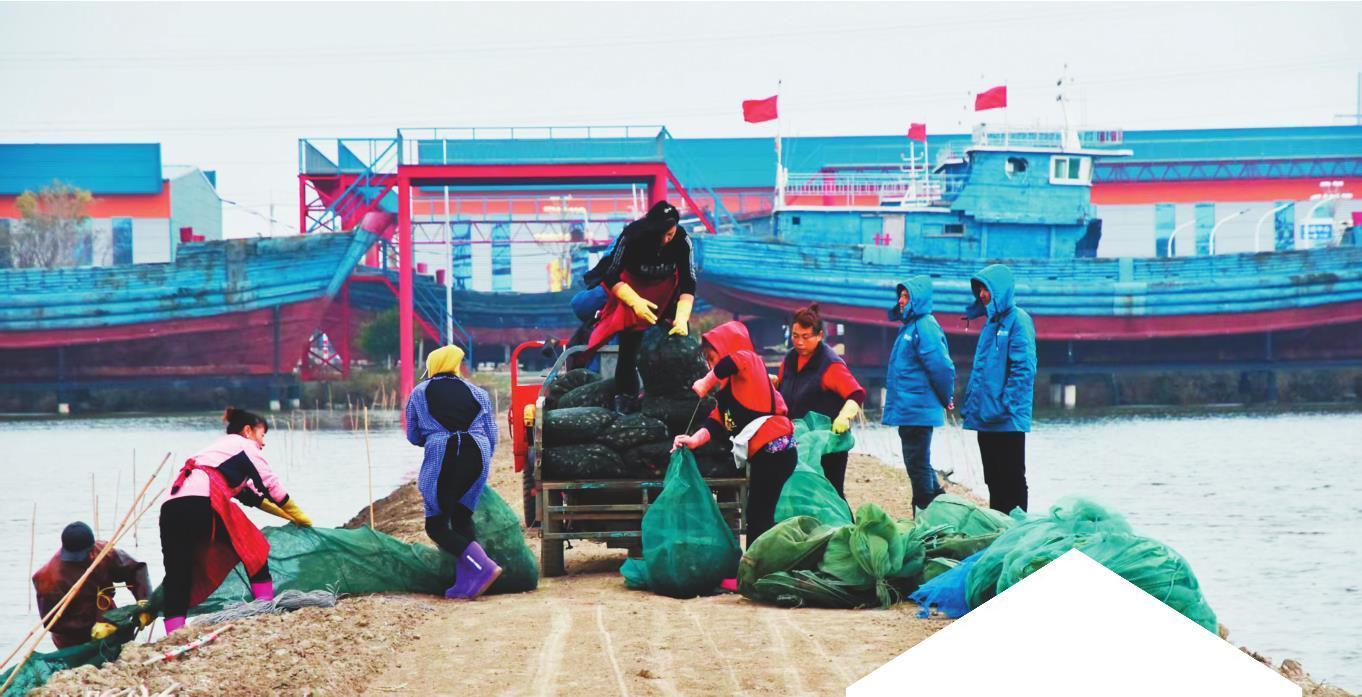 工人在冬储池边拉网,将扣蟹缓缓送入河中。