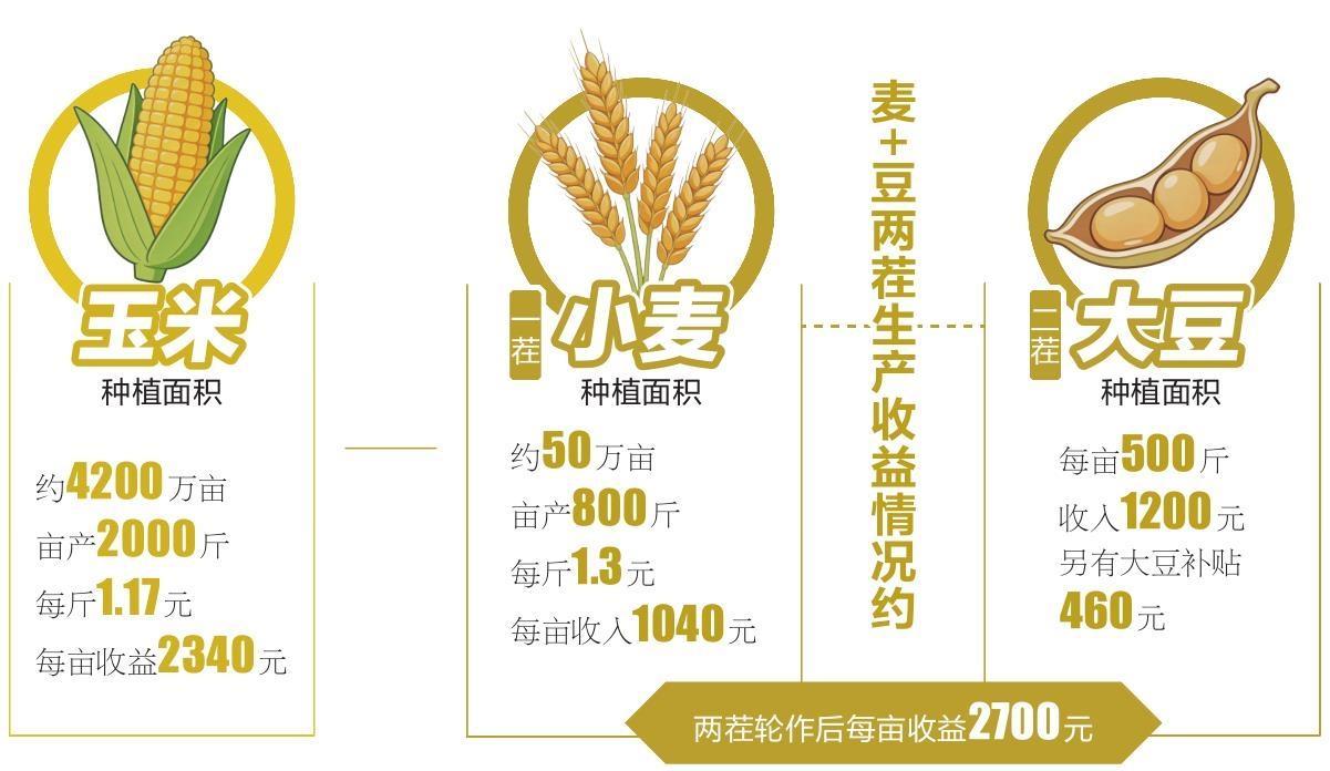 “目前,国内大豆产能还是不足,需要给予一定的生产补贴才能调动生产者的积极性。东北地区采用‘麦+豆’二茬生产模式,可以在增加农民收益的同时,有效扩大大豆种植面积,维护国家粮油供给安全。”葛维德解释。