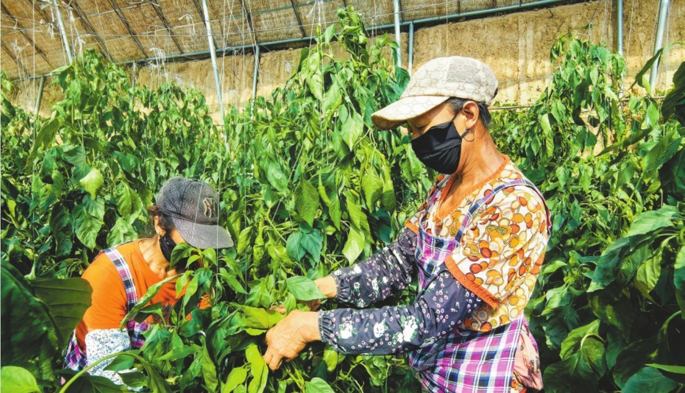 2018年春天,双城子村利用壮大村集体经济扶持资金和扶贫开发资金成立了盛鑫绿色蔬菜种植专业合作社,实行“村社合一”发展模式,建高标准大棚,用于种植“九月青”豆角等蔬菜。为了倒茬轮作、进一步增加收入,经过考察,今年6月,双城子村从山东寿光引进螺丝椒种苗进行试种。