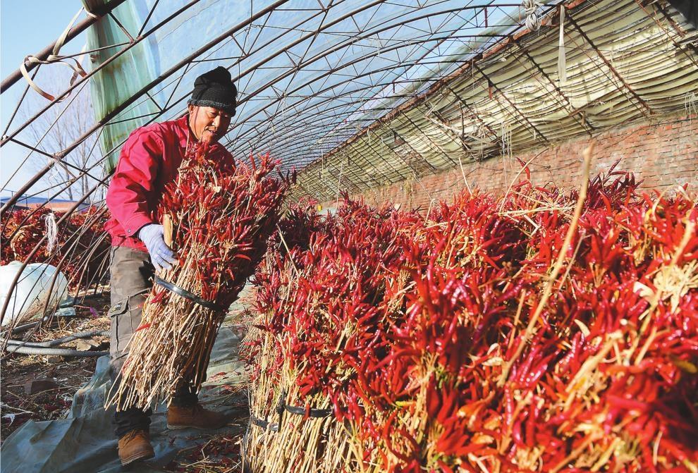 11月29日,朝阳市朝阳县西营子乡仇家店村的暖棚冷棚、庭院晒场里一片火红,村民正忙着摘辣椒、晒辣椒、选辣椒。饱满的朝天椒堆成的“小山”,映红了村民满足的笑脸,更照亮了乡村的致富路。据悉,仇家店村的辣椒种植面积已发展到1000多亩,60多户村民实现增收。