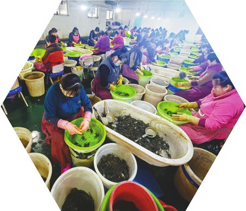 图②为工人们熟练地进行扣蟹分拣、称量、装袋、冲洗与预冷作业。